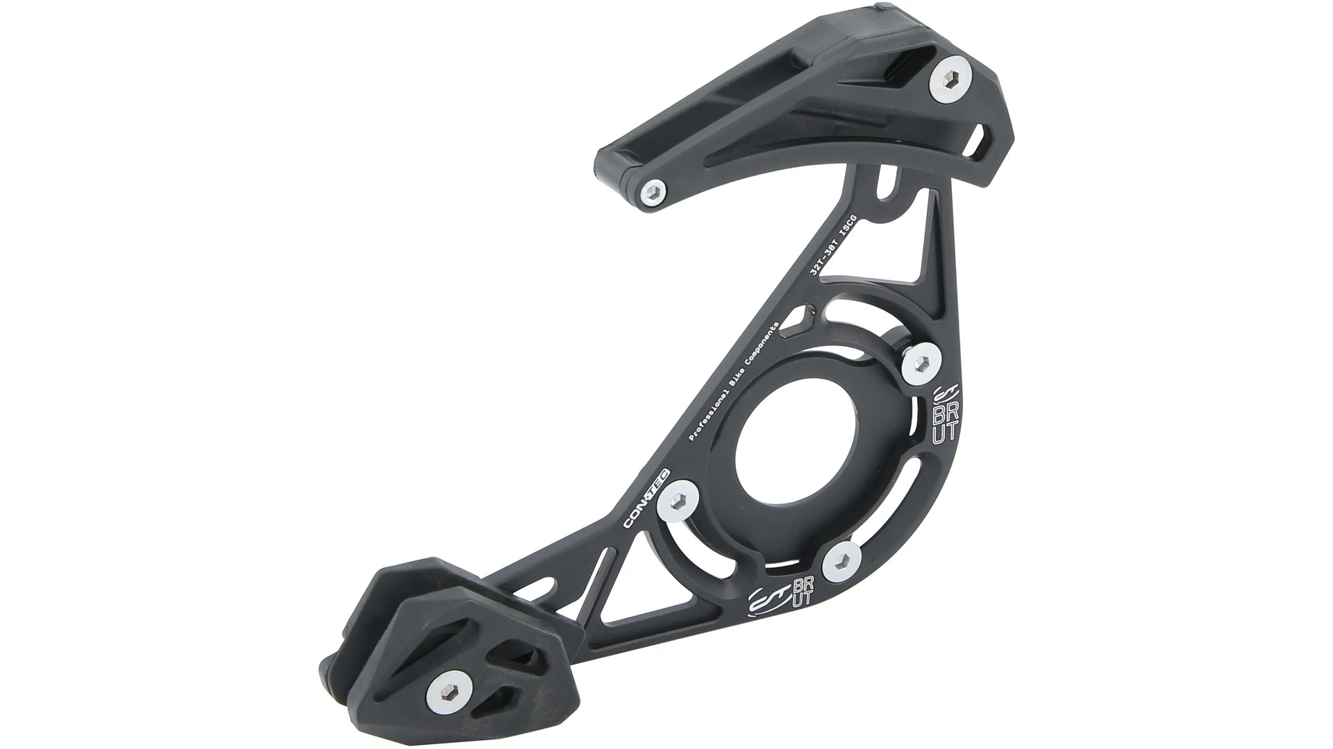 A CONTEC "Brut" láncvezető tökéletes megoldás minden MTB és cyclocross kerékpárhoz, amely csak egy lánckerékkel rendelkezik. A láncvezető könnyű, ISCG05 CNC-marású és edzett alumíniumból (AL 6061) készül, ezért kemény terepen történő használatra tervezték. A súly csupán 149 g. A fehér, nagy szilárdságú és alacsony súrlódású nejlonvezetők és a zártcsapágyas görgők biztonságos, sima láncvezetést és láncleesés elleni védelmet biztosítanak. A vezető 32-38 fogú lánckerekekhez alkalmas, és könnyen hozzáférhető csavarok segítségével egyszerűen felszerelhető. Az középcsapágy adaptert és a megfelelő alátéteket mellékeljük, ha nincs ISCG rögzítés. A láncvezető ideális azok számára, akik el akarják kerülni a láncleesést egyenetlen terepen.