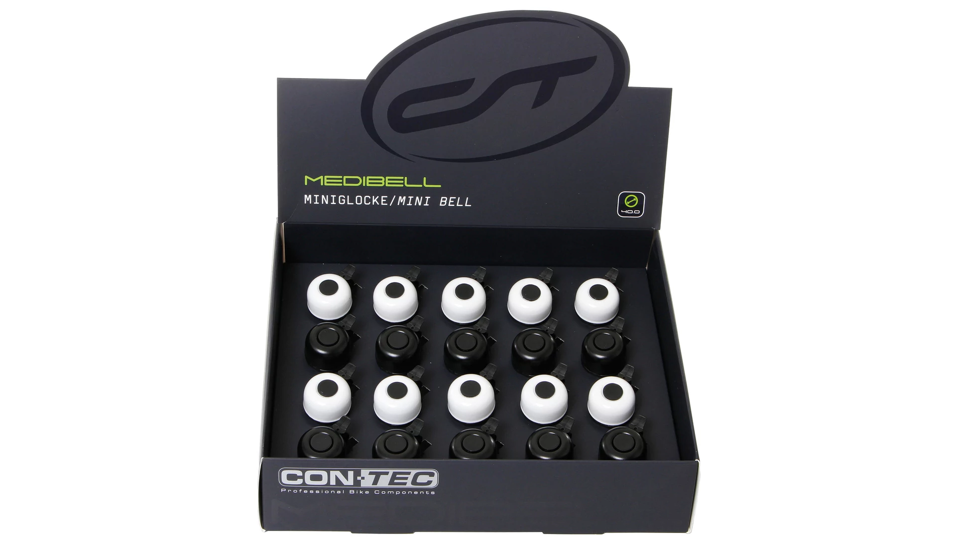 A CONTEC "Mini Bell" mini csengő apró, de hangos. Az alumínium a jellegzetes, jól hallható magas hangot ad. A csengő átmérője 33 mm. Könnyen rögzíthető a kerékpár kormányához (22,2 mm átmérőig). A "Mini Bell" színes színválasztékban kapható. Klasszikus fekete vagy fehér, csillogó ezüst, kék és piros áll rendelkezésre.