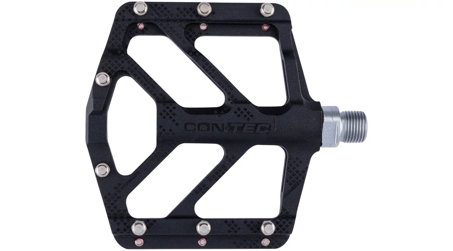 A CONTEC "Spatula II" az alumínium keret és alumínium test egy darabból álló kombinációjából áll, amely nagyon merev és robusztus. A normál 9/16"-os, különösen erős CrMo acélból készült menetes CNC-marású tengelynek köszönhetően a pedál még a legkeményebb igénybevételnek is ellenáll, és könnyen felszerelhető szinte bármilyen hajtókarra. A nagy érintkezési felületeken található cserélhető CrMo csapok biztosítják a legjobb tartást. Ezek még sáros és nedves körülmények között is ideálisak a tapadáshoz és szükség szerint módosíthatók. A tömített csapágyak egyenletes forgást és hosszú tartósságot biztosítanak és ellensúlyozzák a nedvesség és a szennyeződés behatolása miatti kopást. Kiváló minőségű kidolgozásának, mindössze 340 g-os súlyának és ésszerű kialakításának köszönhetően a "Spatula II" pedál ideálisan megfelel a freeride követelményeinek.