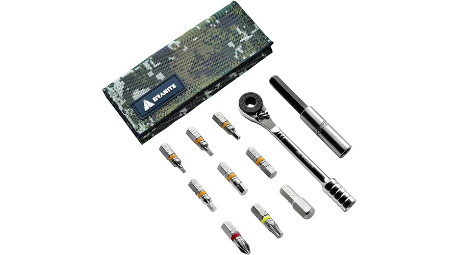 Racsnis hajtókaros zsebszerszám összehajtható szövet tokban.