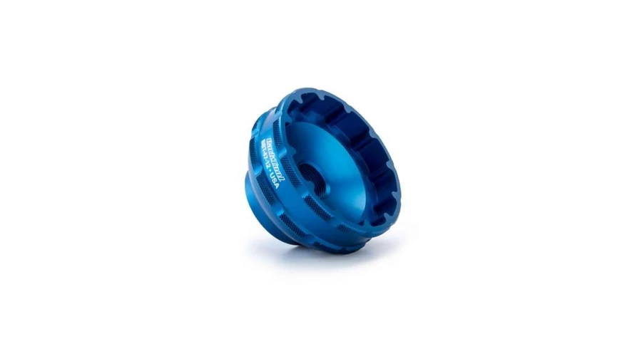 Egy precíziós CNC-megmunkált, 12 körmös alumínium szerszám a kiválasztott menetes alsó középcsapágyak beszereléséhez és eltávolításához. Külső átmérője 50–53 mm, belső átmérője 48,2 mm.